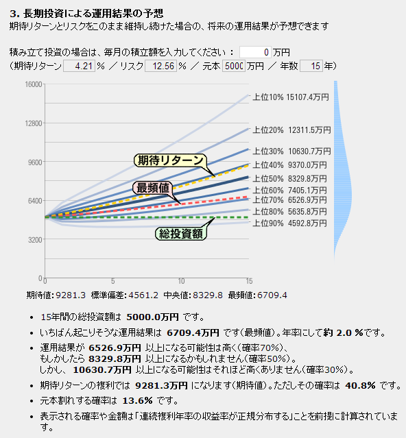 投資ポートフォリオは単純化して、このツールで提供されている5アセットへの1000万円ずつの均等投資とします。なお、投資の成果についてはファンドの海の長期投資予想/アセットアロケーション分析を利用します。信託報酬等のコストとして0.5%を想定すると以下のような数字が出ました。