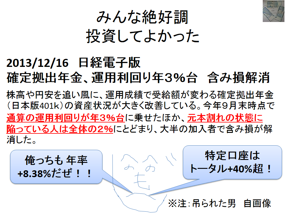 「預金等もあるもののリスク資産では基本的に買い持ちになる確定拠出年金でほとんどの人がプラスになっている→多くの人が利益になっているよね」という話です。