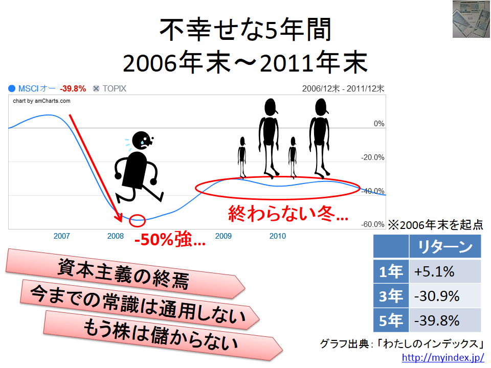 3ページ目から時間を約2年後ろに戻して2006年末〜2011年末の5年間で同じ全世界株式インデックスを見てみると、全く違うグラフの形に。