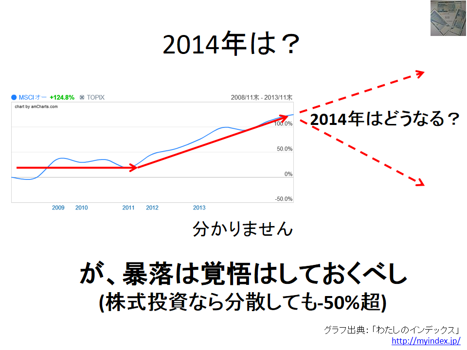 2014年がどんな相場になるかは分からない。しかし、先のスライドにあったような暴落があってもおかしくないことを想定しておくことが重要。ここが一番重要。