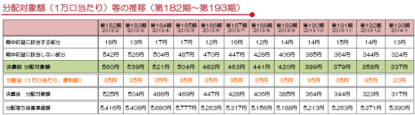 ここ12か月の決算前分配対象額を見ると、560円(2013年2月)→337円(2014年1月)と大幅に減少しています。これは35円の分配金に対して、その期中の収益が12円〜18円と非常に少なくなっているからです。