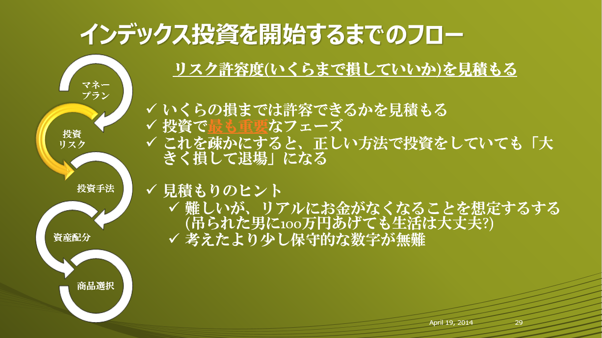 このブログでもセミナーでも、投資プロセス決定の初期の重要な要素として取り上げていますが、インデックス投資の基本中の基本はリスク許容度の範囲内で投資することです。(別にインデックス投資に限らない)※参考1:投資する時に考える順番はリスクが最優先