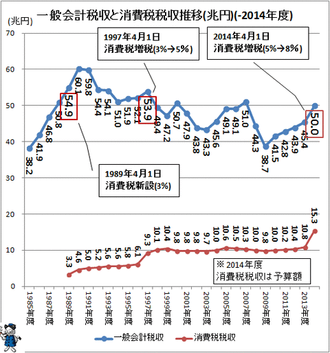 例えば、「消費税 増税 税収」でGoogle検索した時に一番上に引っかかったのは消費税と税収の関係をグラフ化してみる(2014年)(最新) (Garbage NEWS.com)でしたが、ここでは以下のようなグラフと結論が掲載されています。