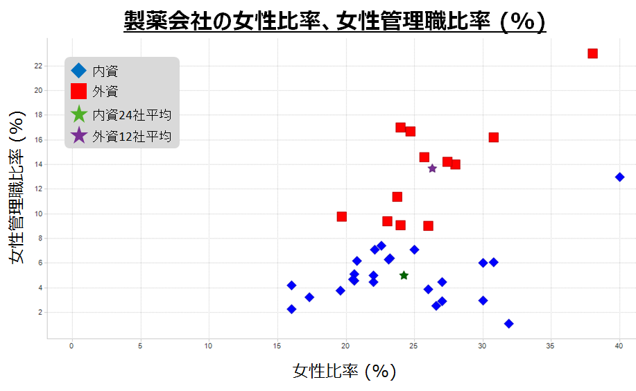一方、女性管理職比率となると大きな差がありました。散布図では縦軸に女性管理職比率を取りましたが、下に内資/上に外資と見事なまでにきれいに分かれています。