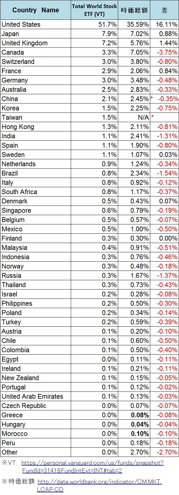 全体的な傾向として、対時価総額で考えると、「VTは先進国の方が組み入れ比率が高く、新興国の組み入れ比率が低くなっている」と言えます。
