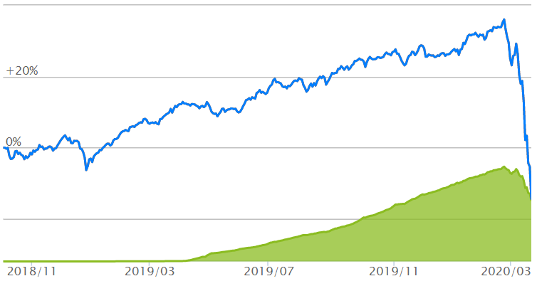 つまり,株も下がれば,レバレッジをかけた債券部分もマイナス方向に動いたためショックを緩和できず,以下のように2月21日の13,604円から1か月後の3月19日までで8,559円と約37%のマイナスです。
