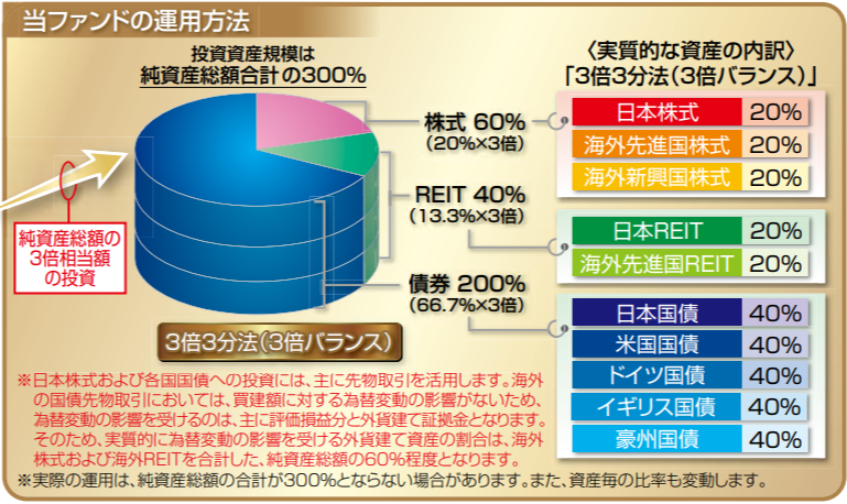 一時期,マニアの間で話題になった(らしい)「グローバル3倍3分法ファンド」も以下の図のように債券を200%持つという少し変則的ですが,3倍のレバレッジファンドです。