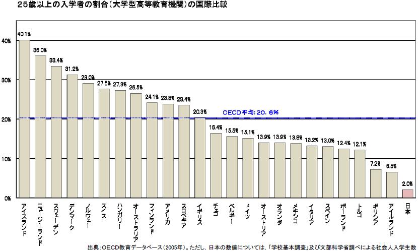 文部科学省の「大学規模・大学経営部会」の(第5回) 配付資料として配布された資料から抜粋したグラフです。日本は25歳以上の割合が圧倒的に少ないですね。
